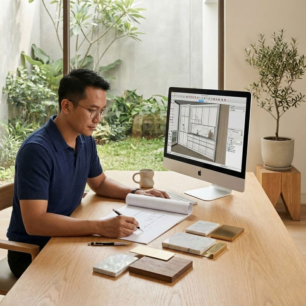 Jangan menebak hasil renovasi. Dapatkan Desain 3D + RAB detail di awal. Cocok untuk makeover dapur, kamar mandi, atau interior modern.